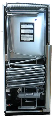 The active ingredient is ammonia, which turns from liquid to vapor and back to a pure liquid again. This pure ammonia liquid absorbs the warm air through aluminum plates on the fridge back wall, freezer back wall, and freezer floor. This system uses no motors, compressors, or any moving parts. This is all accomplished by heat boiling the solution and rising to the top of the sealed system where gravity takes over and allows the liquid to flow through the coil system at a rate determined by slight downward angles of the tubing.