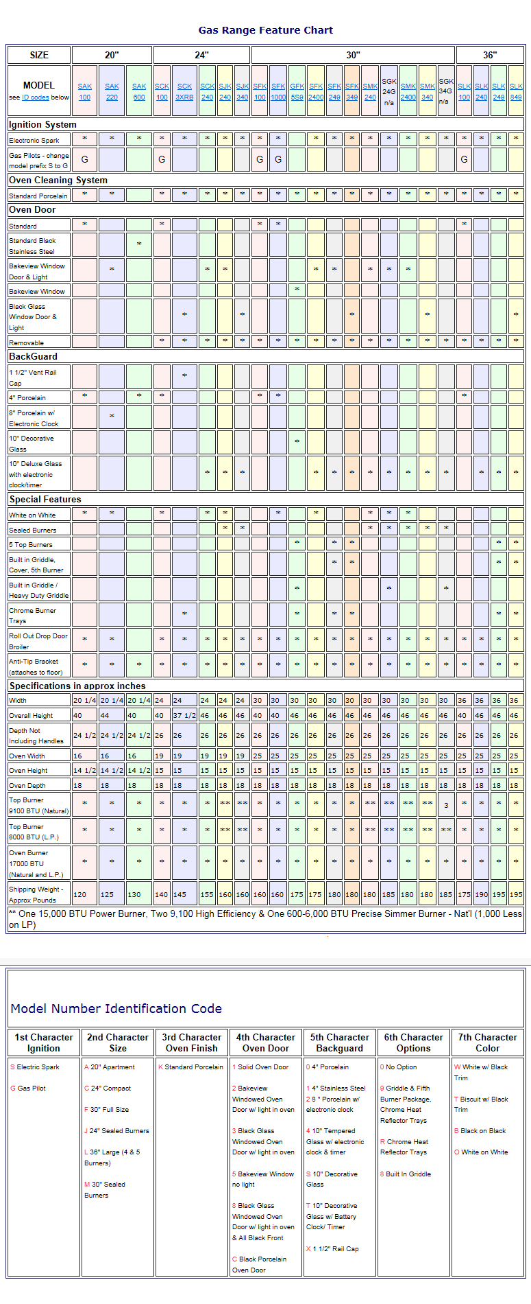 Are you in the market for a gas range? Find your desired gas range specifications on this detailed chart. Some models are true non-electric appliance or off-grid appliance for homes with no or limited electricity. Peerless Premier has been producing gas appliances made in the USA for over 80 years.